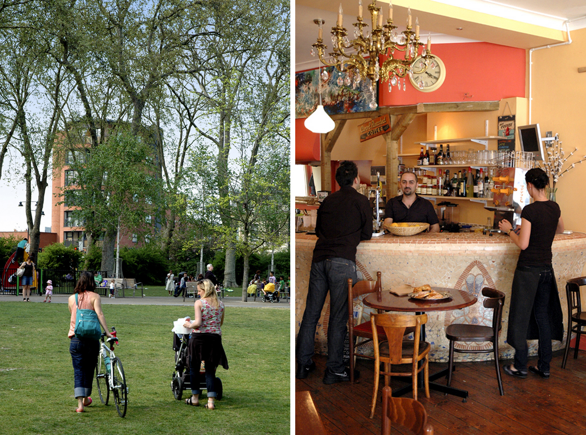 Newington Green, London. Bordering Islington and Hackney, Newington Green is an open space surrounded by shops, cafes and housing.