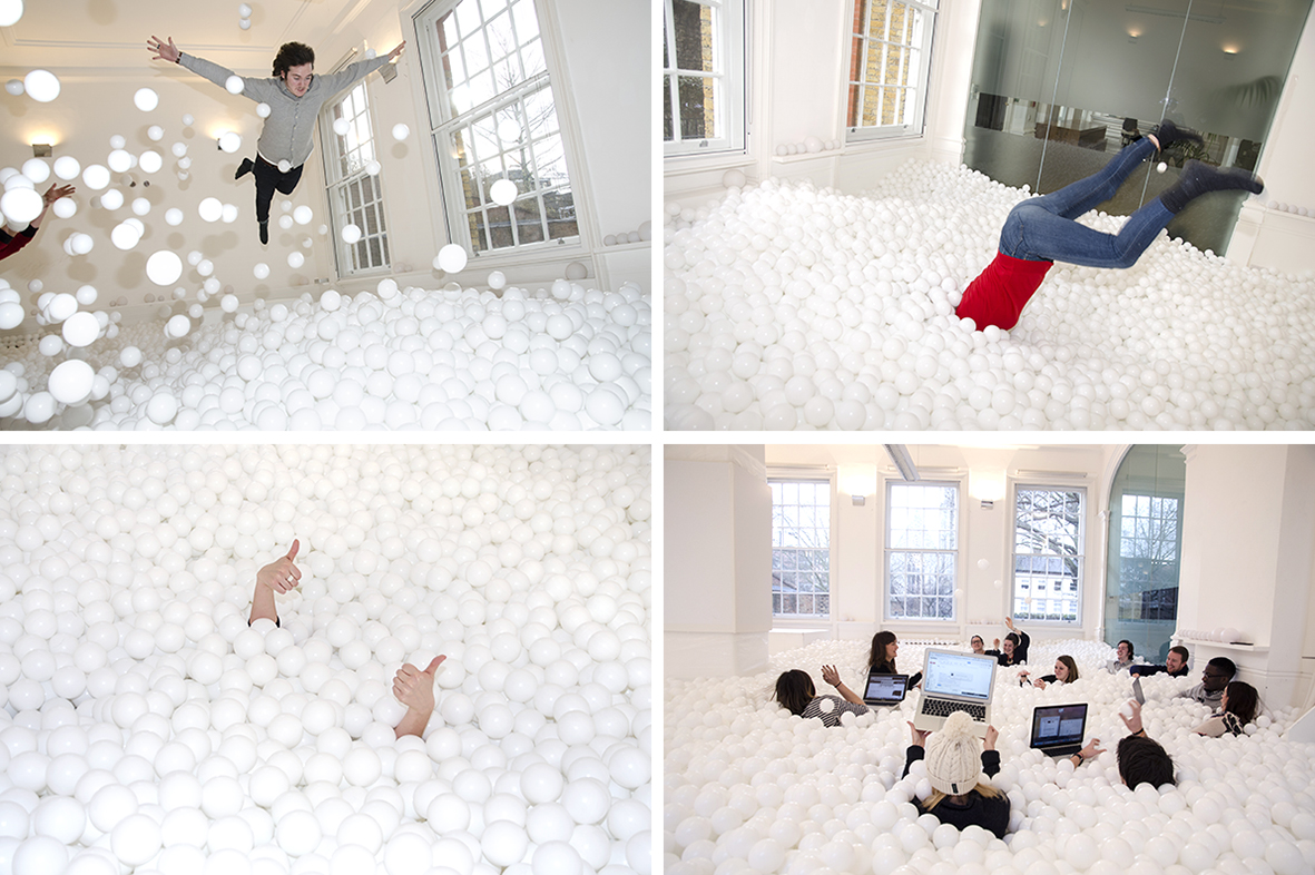 A creative agency in West London recently turned their exhibition space in to a ball pool that adults could play in – 81,000 white balls to throw yourself in to! Of course everyone went mad for it and once the press got wind of it, it completely booked up in an instant. I was lucky enough to shoot it (and have a jump around!)